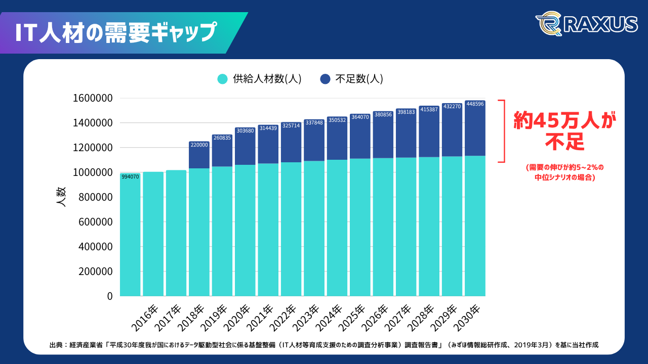 経済産業省の調査によると、このままIT需要が伸び続けた場合、2030年には約79万人ものIT人材が不足すると予測されています。