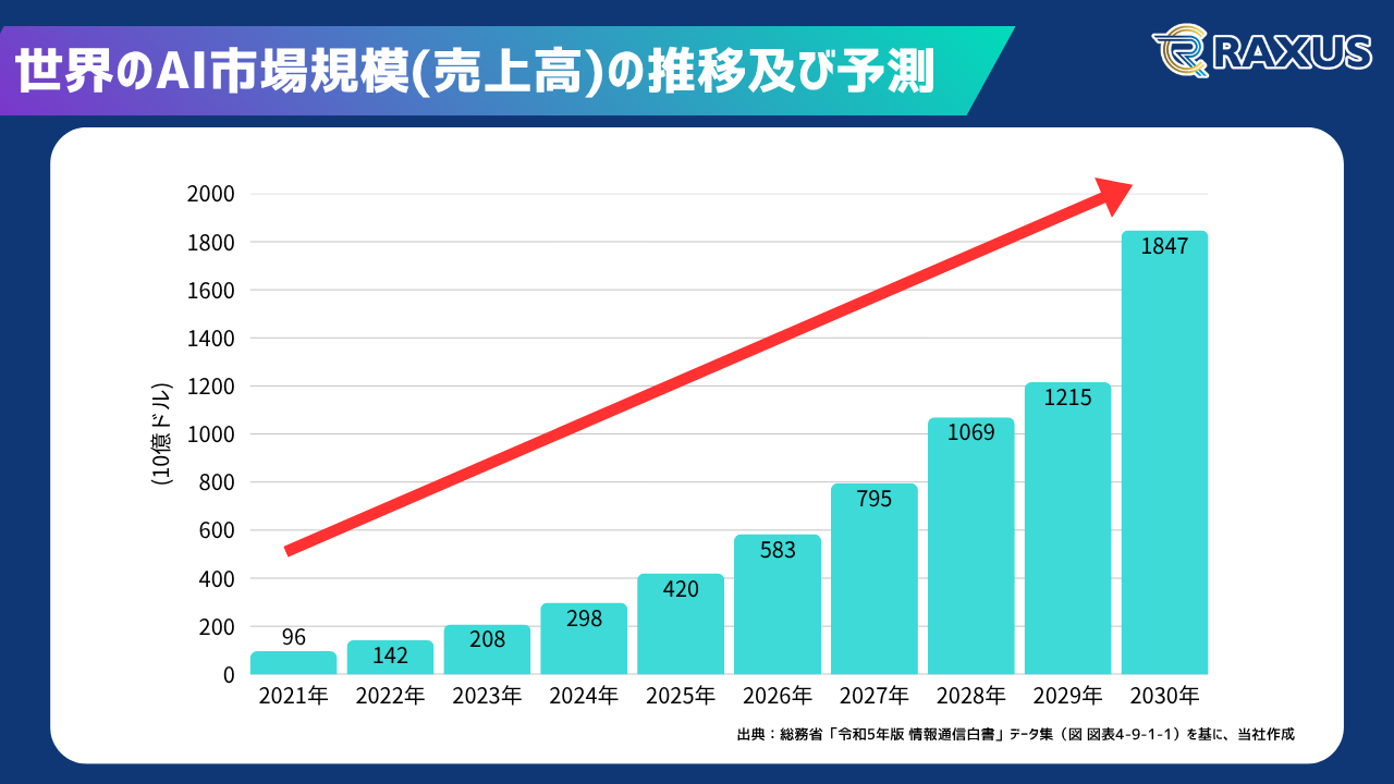 総務省のデータによれば、AI市場の規模は今後も右肩上がりで拡大が見込まれています。