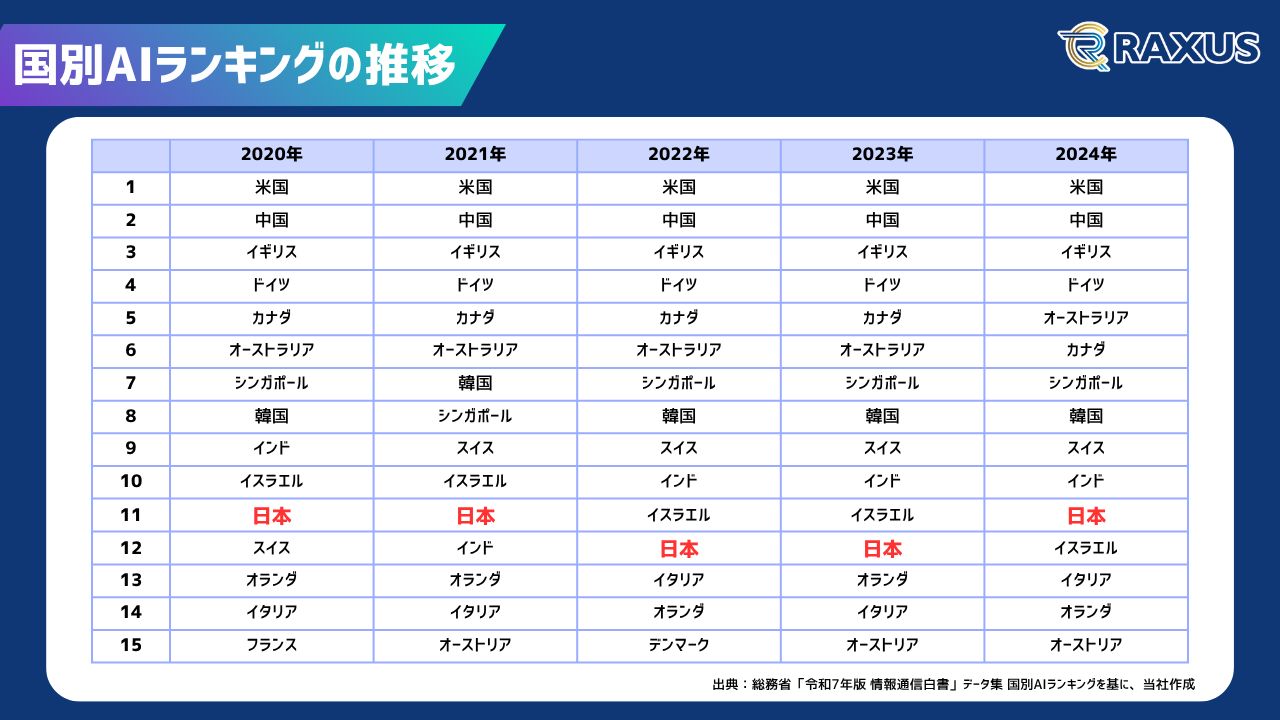 総務省が公開する国別AI活用ランキングによると、米国・中国が常に上位を独占する一方で、日本は依然として後方に位置しています。