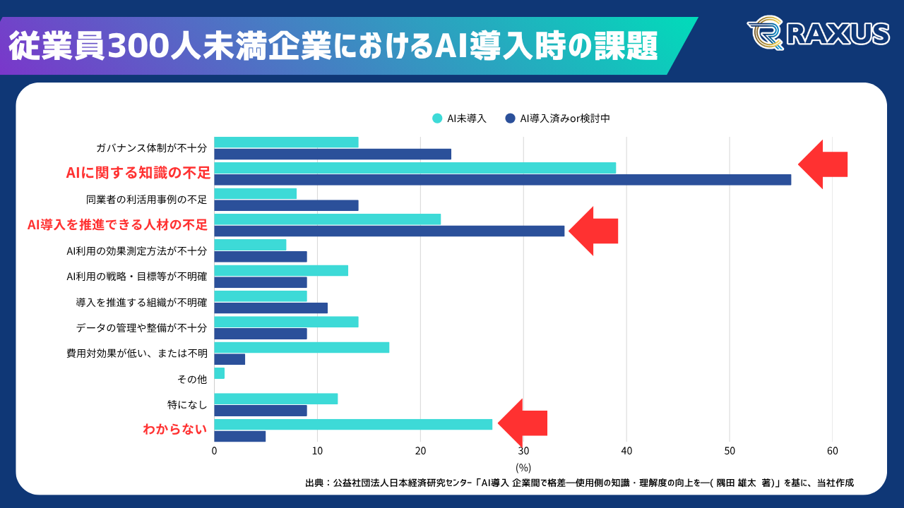 公益社団法人日本経済研究センターの調査によると、AIの導入・未導入を問わず、最も多く挙げられた課題はやはり「AIに関する知識不足」でした。