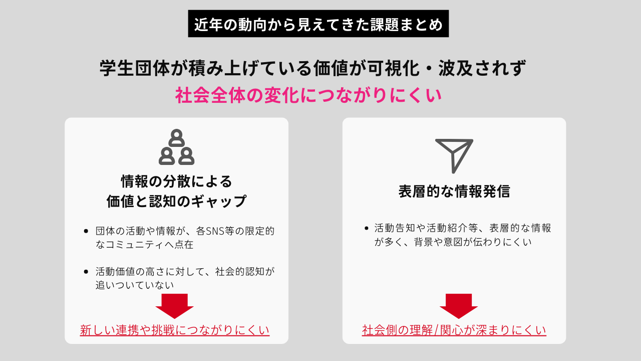 加えて、発信される情報も表層的な内容に留まりやすく、活動の背景にある課題設定や意図が伝わらないことで、社会側の理解や関心が深まりにくいという構造的な問題も見えてきました。結果として、学生団体が積み上げている価値が広く共有されず、社会全体の変化につながりにくいという課題が顕在化していました。