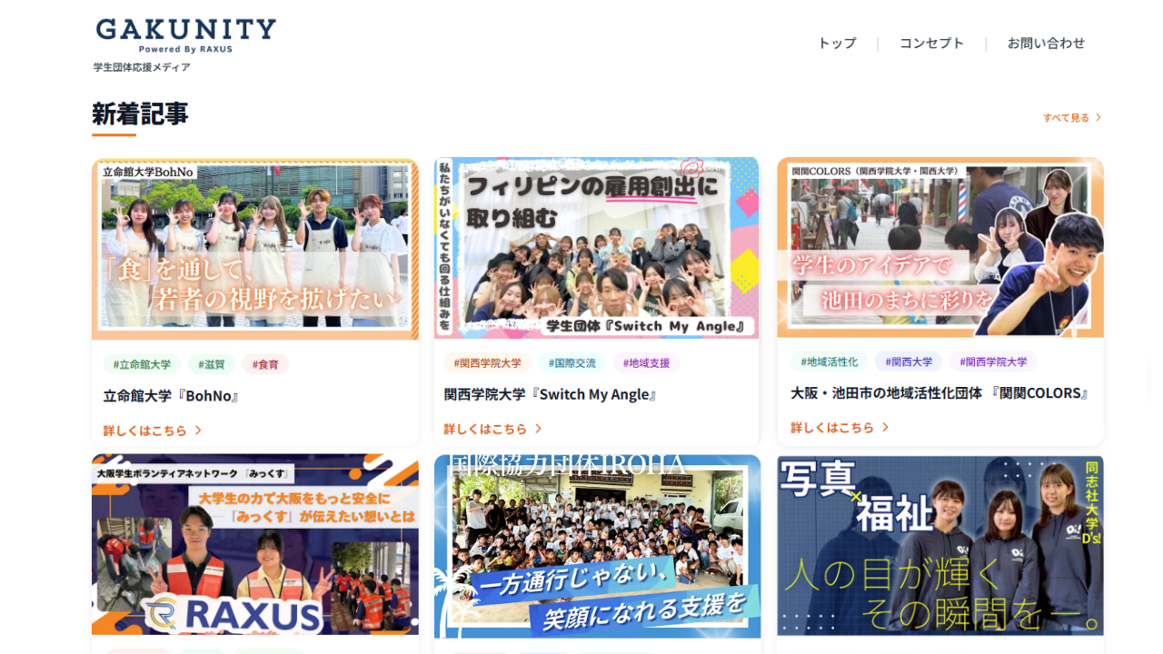 ラグザスが運営するGAKUNITYは立ち上げから約3か月という短期間で、関西圏を中心に30を超える学生団体への取材と記事化を進めてきました。