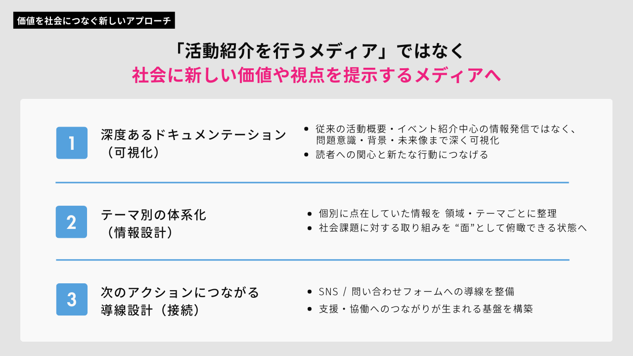 このメディアでは、活動を単に紹介することをゴールとするのではなく、問題意識の根底にある視点や、どのような未来を描いているのかまで深く可視化することで、社会課題に向き合う取り組みの理解を促進し、新たなつながりや行動のきっかけになる循環を創り出します
