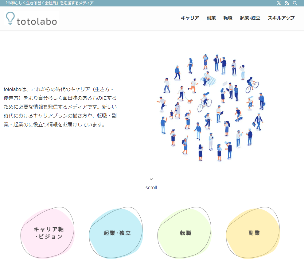 「令和らしく生きる働く会社員」を応援するメディア『totolabo』は、これからの時代のキャリア(生き方・働き方)をより自分らしく面白味のあるものにするために必要な情報を発信するWebメディアです。新しい時代におけるキャリアプランの描き方や、転職・副業・スキルアップに役立つ情報などを軸に情報を発信しています。